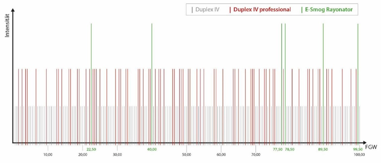 举例来说,检测“Duplex IV”频率共振仪附近的189个对人体非常重要的建筑生物学基本频率值,测量所得的74个共振值(以红色显示)可以通过频率储存专用电线传输到“Duplex IV专业版”频率共振仪中。如果存在任何因电磁辐射或脉冲辐射所造成的严重负荷,可以将相应的调和器连接到“Duplex IV专业版”频率共振仪(以绿色显示),如图所示。